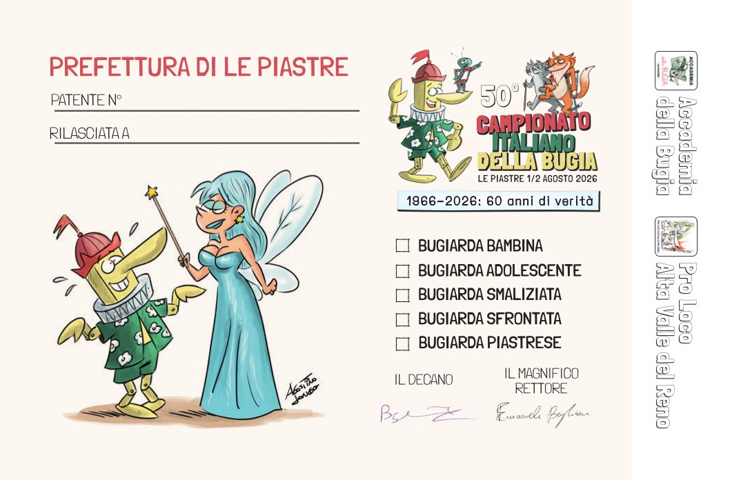 La conferenza stampa di presentazione del tema e degli eventi collegati è stata anche l’occasione per presentare la Patente di Bugiardo 2026, realizzata dal vincitore dell’edizione dello scorso anno, il disegnatore salernitano Agostino Longo e disponibile a 10 euro richiedendola ad accademiabugia@gmail.com