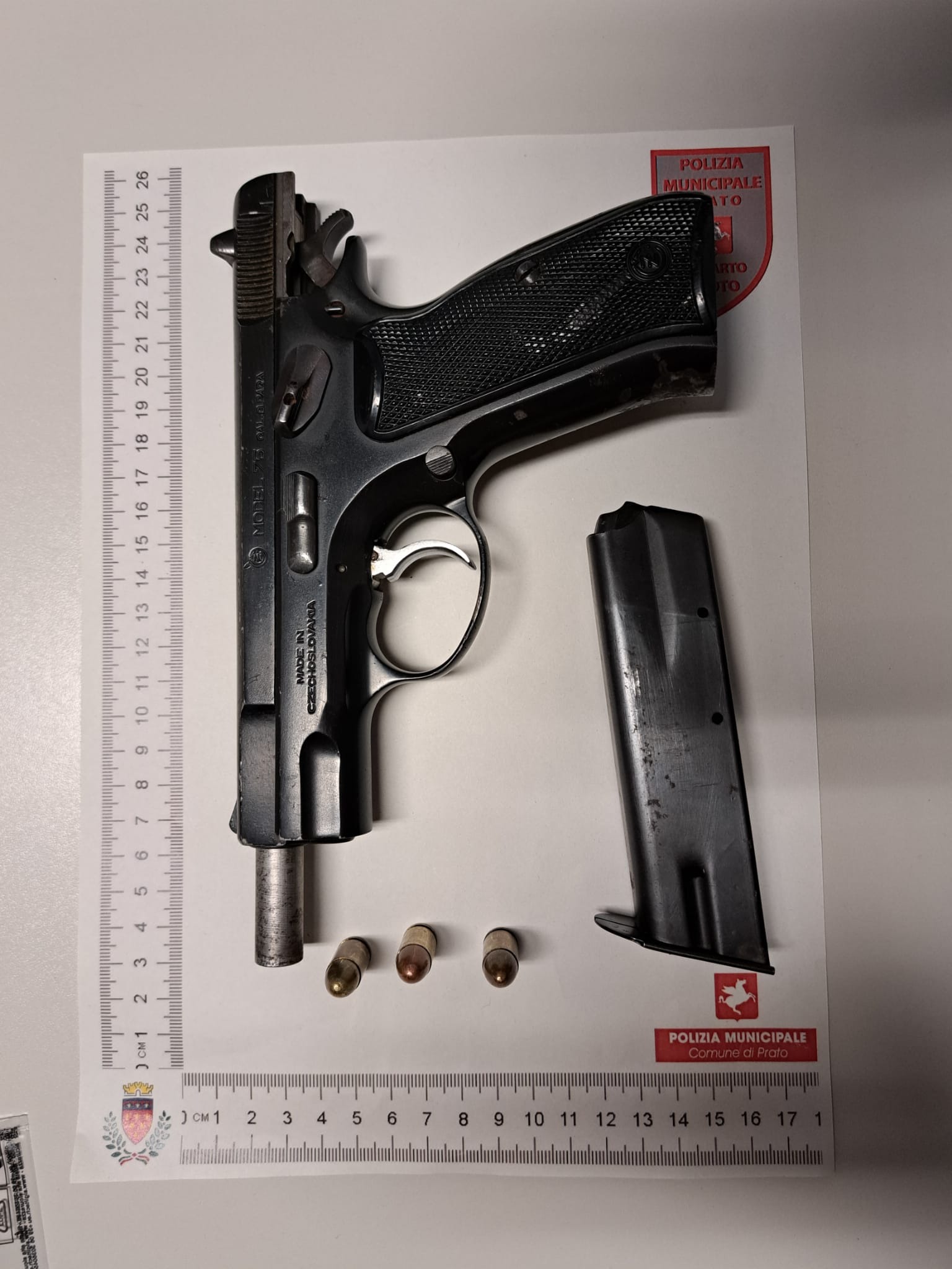 A quel punto è scattata la perquisizione del veicolo e sono stati trovati anche una pistola CZ 75 calibro 9×19 parabellum che è risultata clandestina, priva di matricola, e un caricatore con tre proiettili inseriti, sotto il sedile del guidatore, poi un manganello estensibile lungo 63 centimetri, un bastone di legno lungo 75 centimetri.