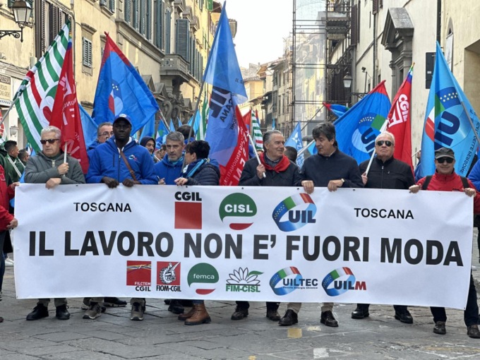 “Grande risposta alla manifestazione regionale di Cgil, Cisl e Uil per la qualificazione delle filiere e la tutela dell’occupazione del settore moda, che occupa oltre 110mila persone (il 40% degli addetti del manifatturiero), colpito da una grave crisi. Alta l’adesione allo sciopero di otto ore che in provincia di Firenze, epicentro della crisi che tocca però tutta la regione, era stato proclamato da Filctem-Cgil, Femca-Cisl, UilTec e Fim-Cisl, Fiom-Cgil, UilM, ovvero le categorie dei settori concia-tessile-abbigliamento-