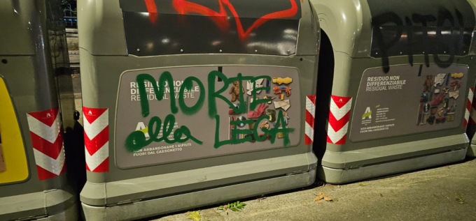 Nello specifico, presso i cassonetti della spazzatura posti dinanzi alle vetrate troviamo scritte recanti “morte alla lega” o “odia la lega” e la firma “antifa” sul manto stradale.