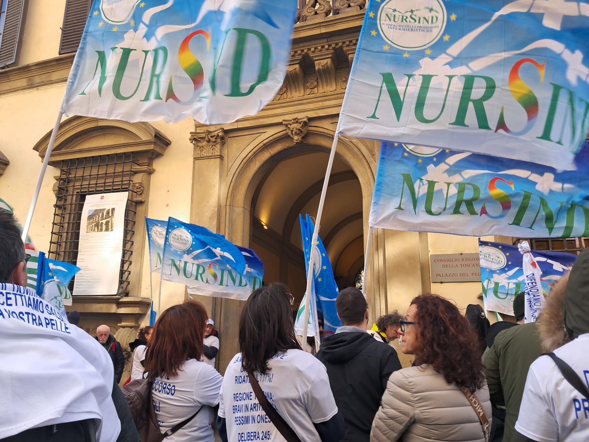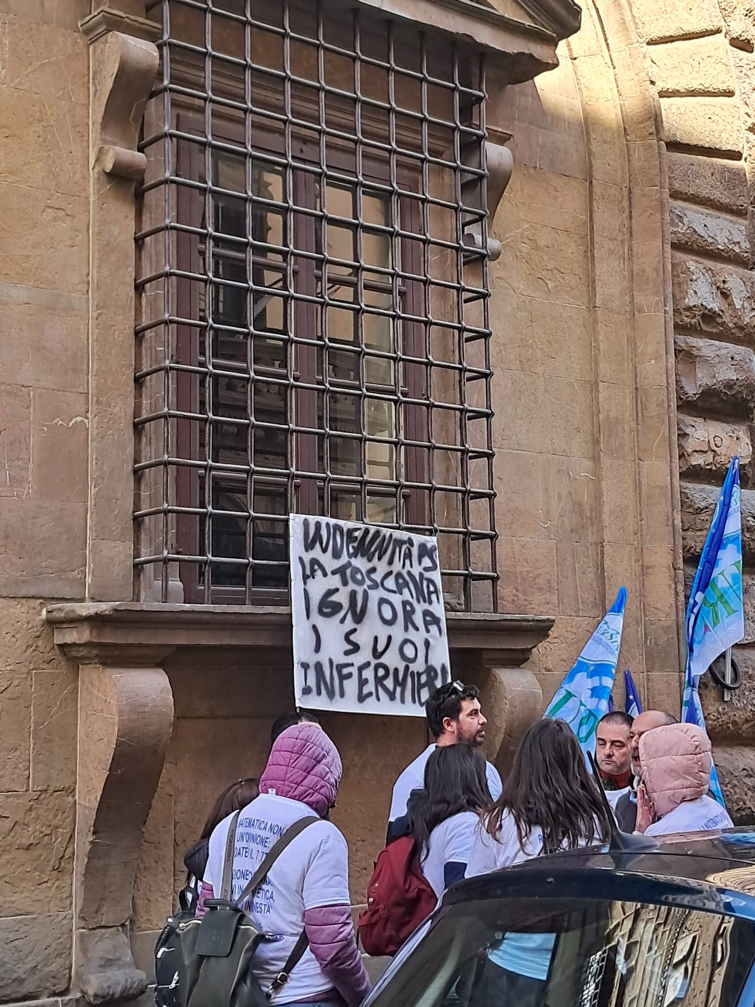 Un centinaio i partecipanti al presidio promosso da Cisl Fp, Nursing Up, Nursind e Fials: tra bandiere, fischietti e un coro ripetuto più volte “Vergogna, vergogna!”. I partecipanti al presidio indossavano magliette con scritto ‘Vergogna’ davanti e vari slogan sul retro. Tra gli altri ‘Basta giochi di prestigio sui nostri arretrati’, ‘Giani i conti non tornano: paga il dovuto!’, ‘Non accettiamo saldi sulla nostra pelle’.