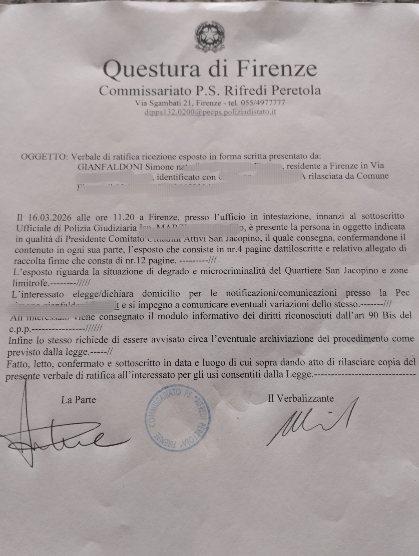 E’ una delle aree di Firenze più bersagliate: furti, spaccate, atti di vandalismo sulle auto, scippi: stiamo parlando di San Jacopino, nel quartiere 1 della città; per questo Simone Gianfaldoni, portavoce del coordinamento Insieme per la sicurezza e del comitato Cittadini attivi San Jacopino, ha presentato un esposto collettivo sulla sicurezza con firme raccolte nei bar della zona, tra piazza San Jacopino, via Galliano, via Doni e via Toselli.